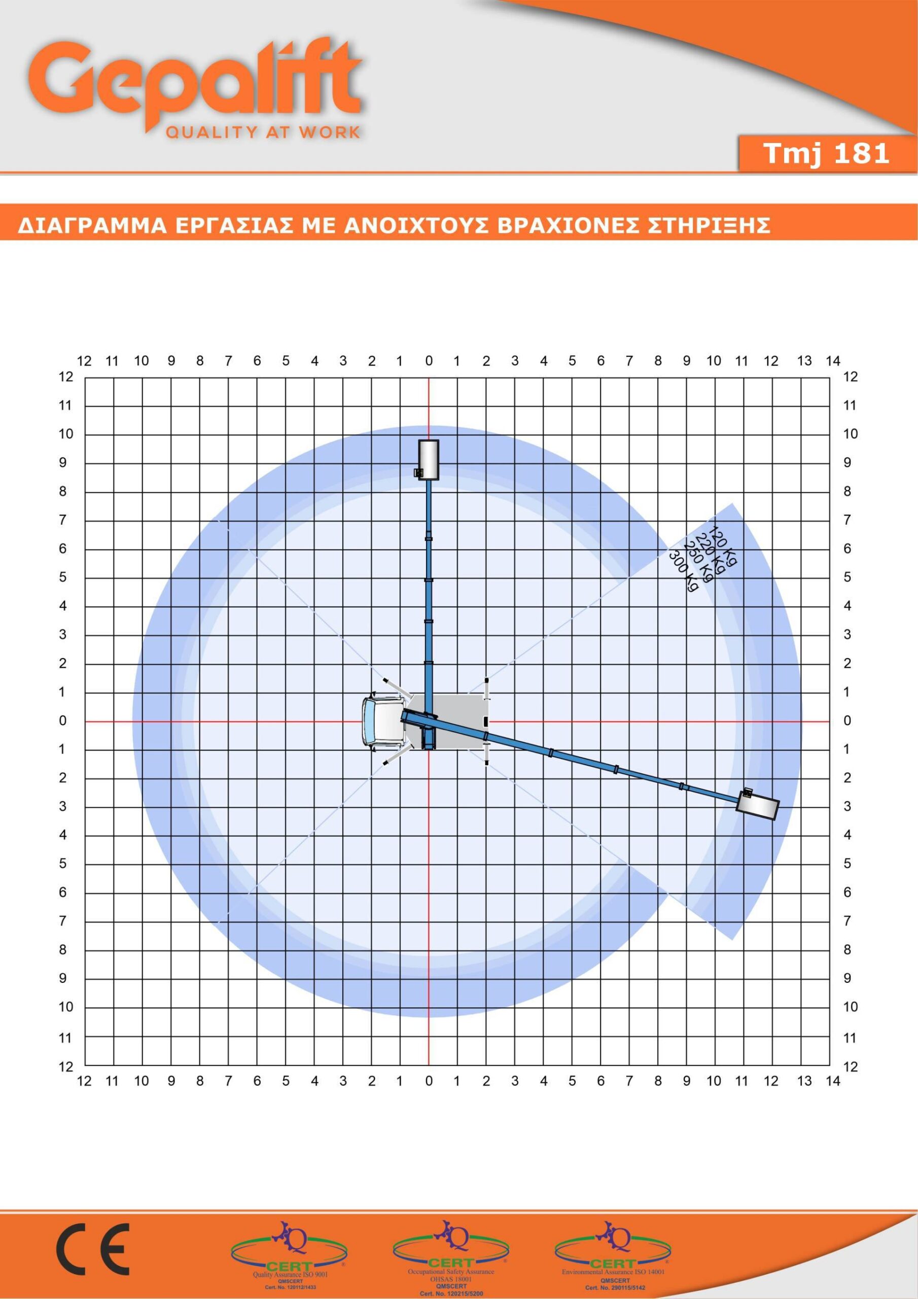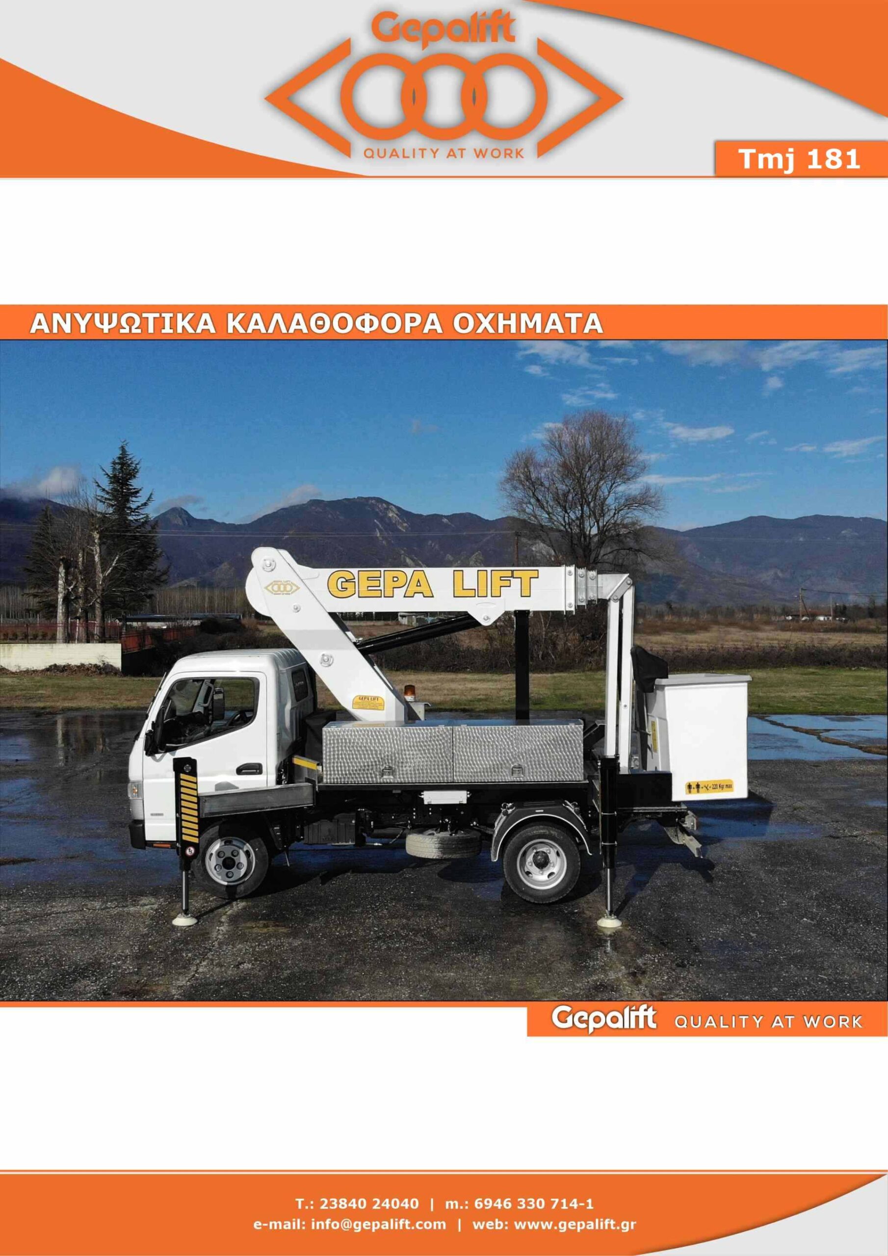 Το καλαθοφόρο ΤΜj 181 διατίθεται για εργασίες ύψους έως 18.1m. Είναι τηλεσκοπικού τύπου, και είναι η ιδανική λύση για αρκετούς και διαφορετικούς τύπους εργασιών. Ο σχεδιασμός και η ποιότητα των υλικών εγγυώνται την ομαλή λειτουργία και την ανθεκτικότητα στον χρόνο, ενώ παράλληλα παρέχει εμπιστοσύνη στον εκάστοτε χειριστή.