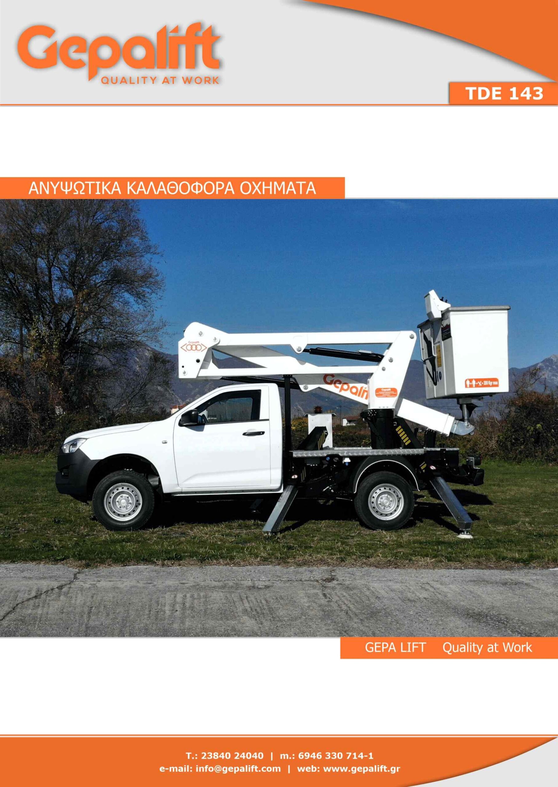 Το καλαθοφόρο TD 143 διατίθεται για εργασίες ύψους έως 14,3m. Είναι αρθρωτού και τηλεσκοπικού τύπου. Είναι η ιδανική λύση για αρκετούς και διαφορετικούς τύπους εργασιών. Ο σχεδιασμός και η ποιότητα των υλικών εγγυώνται την ομαλή λειτουργία και την ανθεκτικότητα στον χρόνο, ενώ παράλληλα παρέχει εμπιστοσύνη στον εκάστοτε χειριστή.
